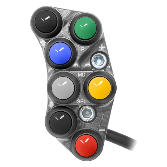 Ao contrário das unidades de interruptores de série, este painel de guidão de corrida foca nas funções essenciais para uso esportivo. O resultado é uma construção limpa, direta e orientada para o motorsport, que se encaixa perfeitamente na característica sem compromissos da Panigale.