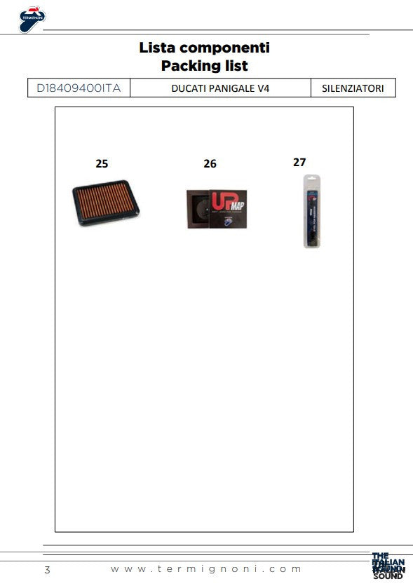 O Kit Slip-On Termignoni para a Ducati Panigale V4/S/R (2018-2024) é uma solução de escape otimizada para desempenho, projetada para uso em pista foi desenvolvido. Com os silenciadores de extremidade em titânio/aço inoxidável e o dispositivo UP-Map, este kit proporciona uma performance otimizada e uma aparência agressiva. O conjunto contém tudo o que é necessário para uma instalação rápida e fácil, e é a escolha perfeita para pilotos de pista que desejam liberar o máximo potencial da sua Ducati.