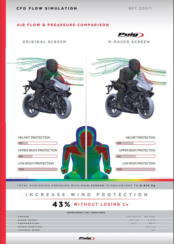 - 30 mm mais alta que a tela original: Proteção adicional para o capacete e parte superior do corpo em altas velocidades.